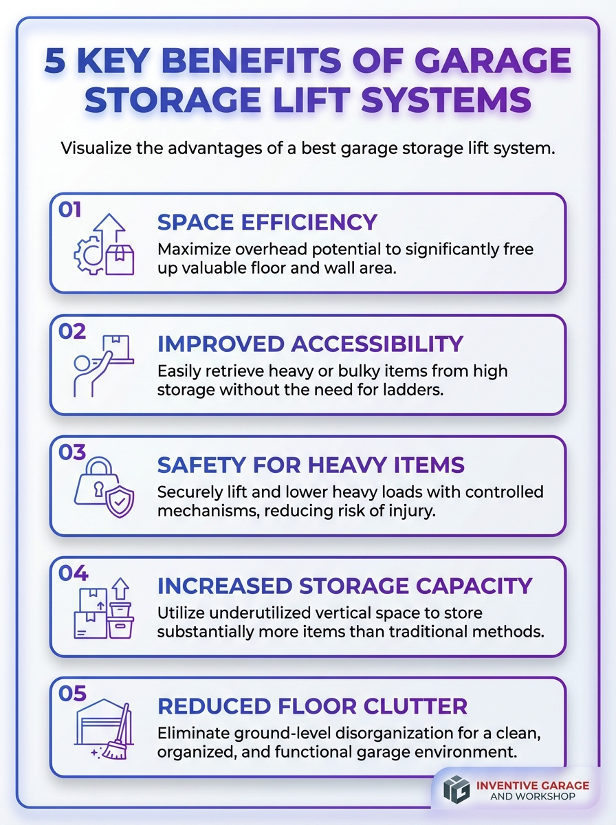 This infographic highlights the five key benefits of garage storage lift systems. Learn how these solutions maximize space, accessibility, and organization in a garage.