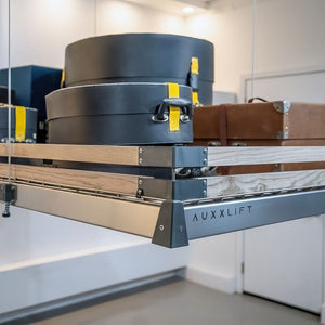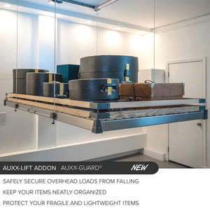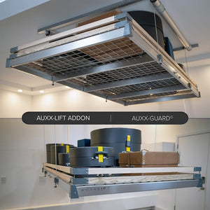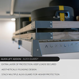 Enhance the safety and organization of your Auxx-Lift with theAuxx-Guard. This essential accessory features two rows of durable wooden slats that provide added protection for your stored items, ensuring they stay securely in place. The Auxx-Guard comes with all the necessary hardware for easy mounting on your lift, making it a practical solution for preventing items from shifting or falling.