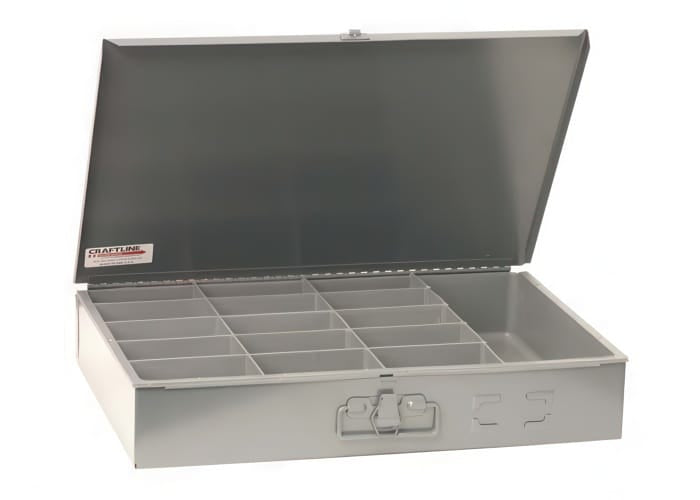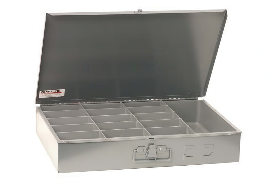 | Lid Style: | Solid steel lid, closes flat over compartments |