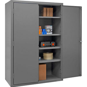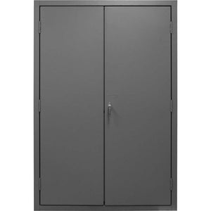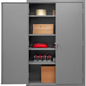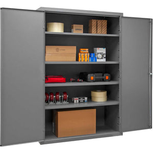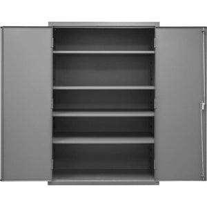 Enhance your storage solutions with the Durham Flush Door Style Storage Cabinet. Crafted from heavy-duty all-welded 14 gauge steel, this cabinet ensures robust durability for your items. The 3-point locking system with a chrome keyed handle and 5/16-inches diameter lock rods guarantees security. The full-height welded piano hinges add strength to the doors, which open wide at 180 degrees, providing full access to your stored contents. The cabinet's adjustable shelves conveniently rest on louver uprights and adjust effortlessly on 4-inch centers without the need for tools. Finished with a resilient gray powder coat finish, this cabinet offers both strength and style. The four shelves, each measuring 48 inches in width and 24 inches in depth, boast a substantial 700 pounds shelf capacity, making this storage solution ideal for heavy-duty items. Upgrade your storage space with the Durham Flush Door Style Storage Cabinet.