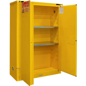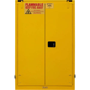 Elevate safety and organization with Durham's Flammable Safety Cabinet, constructed from robust all-welded 16 gauge double wall steel. The cabinet's stability is enhanced by 2-inch wide louvers that support adjustable shelves on 4-inch centers, providing versatile storage solutions. A 2-inch deep leak-proof base guarantees the containment of hazardous chemicals, significantly mitigating fire risks. Enhanced security is assured with a recessed lockable paddle latch and a reliable 3-point locking system. Meanwhile, bunged air vents on each side facilitate proper ventilation. The striking safety yellow powder coat finish enhances visibility and serves as a reminder of its critical role. Measuring 18 inches in length, 43 inches in width, and 65 inches in height, this cabinet ensures a secure and organized environment.
