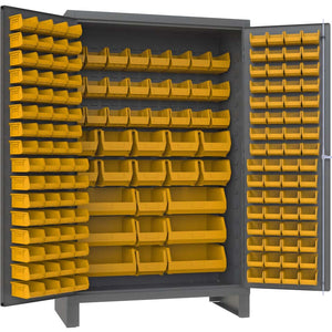 Experience unparalleled storage efficiency with the Durham Heavy Duty All Welded 14 Gauge Steel Cabinet, offering an impressive 171 bins for seamless organization. Equipped with full-height welded piano hinges, this cabinet stands as a testament to the enhanced strength and rigidity of doors. The 3-point locking system, featuring a chrome keyed handle and 5/16-inch diameter lock rods, guarantees secure storage. The fully welded louvered panels reinforce the doors while securely holding the Hook-On Bins, ensuring a remarkable weight capacity of 650 pounds per door (evenly distributed). The double doors swing wide open at 180 degrees, providing unrestricted access to your items. The bins, which easily hook into place without tools, make organization effortless. This cabinet is designed for ultimate convenience, with a 6-inch height base/legs that facilitate forklift access, complemented by pre-drilled holes for floor lagging constructed from sturdy 3/16-inch steel. Completed with a durable gray powder coat finish, this cabinet seamlessly balances functionality and durability.