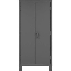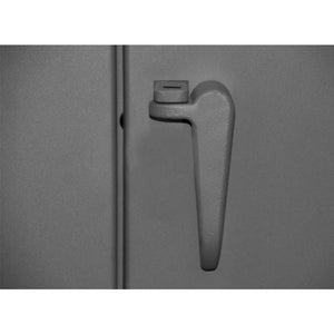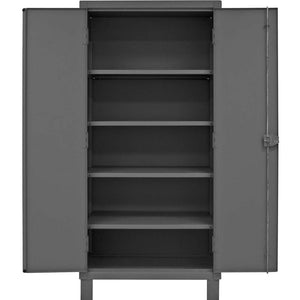 Enhance your storage capabilities with the Durham Extra Heavy Duty All Welded 12 Gauge Steel Lockable Storage Cabinet. Designed for robust security, this cabinet features a 3-point cast steel locking handle with 3/8-inch diameter rods and provision for a padlock (padlock not included). The sturdy 14-gauge heavy-duty shelves, easily adjustable and set on 2-1/4-inch centers using provided fasteners, ensure efficient organization. Reinforced with 7-gauge leaf hinges, the doors resist sagging over time. With a 6-inch height base/legs granting forklift accessibility, and pre-drilled holes for floor lagging crafted from 3/16-inch steel, this cabinet seamlessly combines functionality and durability. Finished with a resilient gray powder coat, this storage solution measures 24 inches in length, 36 inches in width, and 42 inches in height, optimizing storage within compact dimensions.