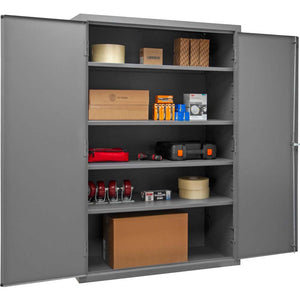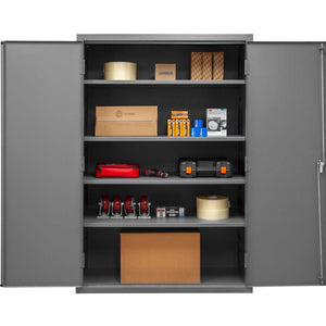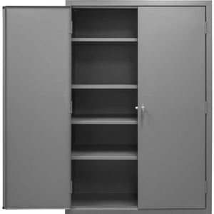 Elevate your storage solutions with the Durham Industrial Duty Strength Storage Cabinet, built to withstand heavy-duty demands. Constructed from robust all-welded 16-gauge steel, this cabinet is fortified for enduring use. The 3-point locking system, equipped with a keyed handle and 5/16-inch diameter lock rods, guarantees security. Its full-height flush doors, reinforced by a 6-5/8-inch wide door reinforcement, boast exceptional strength. The double doors open fully at 180 degrees, providing unhindered access. Adjustable shelves, resting on louver uprights and adjusting easily on 4-inch centers without tools, enhance organizational flexibility. The 2505 and 2506 models, featuring 6-inch height base/legs for forklift access, incorporate pre-drilled holes for floor lagging, constructed from sturdy 3/16-inch steel. This cabinet ships fully assembled, making it a ready-to-use solution. Completed with a resilient gray powder coat finish, this storage cabinet balances durability and practicality seamlessly.