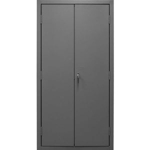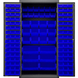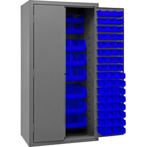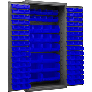 Optimize your storage solutions with the Durham Bin Cabinet, a 36-inch wide storage marvel designed from sturdy 16 gauge steel. This lockable bin cabinet is equipped with 126 Blue hook-on bins, elegantly enclosed within a flush door style for a streamlined appearance. Reinforced by fully welded louvered panels, the door seamlessly holds the Hook-On Bins, ensuring secure organization. The bins attach effortlessly without any need for tools, each shelf boasting an impressive 700 lbs. capacity. The shelves themselves elegantly integrate with the louvered panels, making use of the 700 lbs. shelf capacity, all while eliminating the need for tools. Its industrial-duty construction utilizes robust 16 gauge steel, fortified by full-height welded piano hinges that offer enhanced door strength and rigidity. The security aspect is elevated by a 3-point locking system, featuring a chrome keyed handle and 5/16” diameter lock rods. The double doors swing wide open at 180 degrees, enabling unobstructed access to the entire product. Finished with a textured gray powder coat, this cabinet exudes durability and practicality, epitomizing excellence in industrial-duty storage.