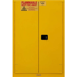 Enhance safety measures with the Durham Flammable Safety Cabinets, meticulously constructed from robust all-welded 16-gauge double wall steel. Boasting 2-inch wide louvers, the shelves are both supportive and adjustable on 4-inch centers, while a 2-inch deep leak-proof base adds an extra layer of protection. Safely containing hazardous chemicals, these cabinets effectively minimize fire risks. Enhanced security is guaranteed through a recessed lockable paddle latch and a 3-point locking system. To promote ventilation, bunged air vents are thoughtfully placed on both sides of the cabinet. The striking safety yellow powder coat finish not only ensures visibility but also resilience. Measuring 18 inches in length, 43 inches in width, and 65 inches in height, these cabinets offer compact dimensions while prioritizing safety.