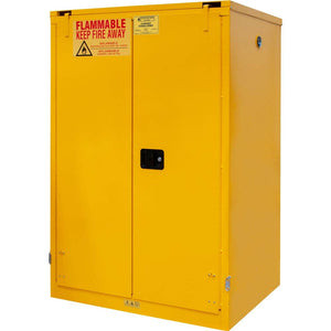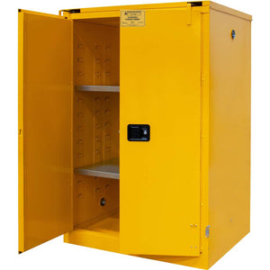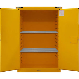 Elevate workplace safety with the Durham Flammable Safety Cabinet, meticulously constructed from robust all-welded 16 gauge double wall steel. The cabinet features 2-inch wide louvers that expertly support shelves, which can be adjusted on 4-inch centers to suit your storage needs. Its 2-inch deep leak-proof base ensures the secure containment of hazardous chemicals, significantly reducing the risk of fire hazards. Enhanced security is a hallmark of this cabinet, as it boasts a recessed lockable paddle latch and a reliable 3-point locking system. The addition of bunged air vents on each side promotes effective ventilation, ensuring the safe storage of volatile substances. Its vibrant safety yellow powder coat finish not only enhances visibility but also complies with safety standards. Measuring 34 inches in length, 43 inches in width, and 65 inches in height, this safety cabinet is a crucial asset for safeguarding both personnel and property.