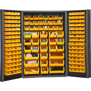 Experience ultimate organization with the Durham Cabinet, equipped with 176 bins to meet your storage needs. Crafted from heavy-duty, all-welded 14-gauge steel, this cabinet stands as a robust storage solution. Enhanced door strength and rigidity are achieved through full-height welded piano hinges, complemented by a 3-point locking system with a chrome keyed handle and 5/16-inch diameter lock rods. The double doors swing open a full 180 degrees, granting uninhibited access. The cabinet boasts a 20-inch main depth, while box-style 4-inch deep doors create a total depth of 24 inches. Reinforced by fully welded louvered panels, each door can handle up to 650 pounds (evenly distributed). The 176 durable polyethylene copolymer Hook-On-Bins, available in five sizes, easily hook into place without the need for tools. A sleek gray powder coat finish ensures durability.