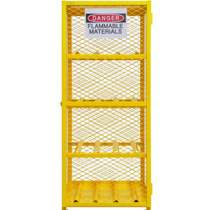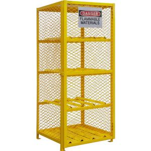 Efficiently store and safeguard up to 8 cylinders with the Durham Horizontal Cylinder Storage Cabinet. Designed with a robust 1-1/2-inch x 1/8-inch angle iron frame, along with solid 14-gauge steel top and bottom components, this cabinet ensures durability and security. Its expanded metal sides, back, and door ensure proper ventilation and visibility of contents, accommodating both 20-pound and 33-1/2-pound LPG cylinders securely held in place by cylinder cradles. The door bears a prominent DANGER FLAMMABLE MATERIALS sign, and its functionality is enhanced by pre-punched lagging holes in the feet, heavy-duty butt hinges to prevent door sagging, and a padlock hasp to secure contents (padlock not included). A magnet keeps the door safely shut when unlocked, in full compliance with OSHA and NFPA standards when properly utilized. Designed for user convenience, this cabinet ships fully assembled and boasts a durable safety yellow powder coat finish, ensuring both functionality and visual prominence.