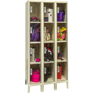 Experience the convenience of Hallowell DigiTech 36" x 12" x 78" tan triple 4-tier locker- unassembled UESVP3228-4PT, providing efficient storage space for your needs. Crafted with a full body of welded sheet steel, this locker features double-flanged connections and single return bends at all sides, ensuring robust construction. Its high-grade powder coating is sprayed and baked at 350 degrees Fahrenheit, resulting in a durable finish that can withstand the test of time. Equipped with 6" feet, the unit is elevated, safeguarding its contents from dirt and potentially harmful cleaning chemicals.