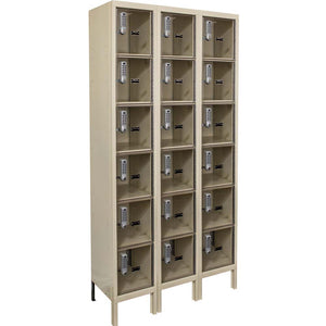 Experience the innovation of Safety-View doors, constructed from single-piece polycarbonate injection molded at all four sides for unparalleled strength and clarity. Each door features a battery-powered DigiTech lock with versatile programming modes, allowing users to choose between single-use 4-digit codes for day use or permanent 4-digit codes for repeated individual access. The continuous piano hinges, riveted to both the door and the frame, ensure effortless access to the locker's contents. With 18 individual boxes, this tan locker can be utilized on its own or combined with other Hallowell locker units, offering ample storage space for equipment and personal belongings in warehouses, offices, schools, and industrial spaces!