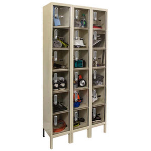 The distinctive Safety-View doors are meticulously crafted with a single piece of polycarbonate, injection molded at all four sides for unmatched strength and clarity. Each door is equipped with a battery-powered DigiTech lock, offering multiple programming modes for user convenience. Choose between single-use 4-digit codes for day use or set permanent 4-digit codes for repeated individual access. The continuous piano hinges, riveted to both the door and the frame, ensure smooth and easy access to the locker's contents. With 18 individual boxes, this tan locker can serve as a standalone unit or be combined with other Hallowell locker units, providing ample storage space for equipment and personal belongings in warehouses, offices, schools, and industrial spaces!
