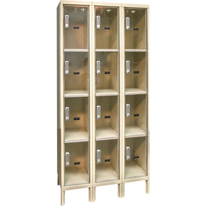 The innovative Safety-View doors are constructed with a single piece of polycarbonate, injection molded at all four sides for optimal strength and visibility. Each door comes equipped with a battery-powered DigiTech lock, offering multiple programming modes. Users can easily select single-use 4-digit codes for day use or set permanent 4-digit codes for repeated individual access. The continuous piano hinges, riveted to both the door and the frame, ensure smooth and easy access. With 12 individual boxes, this tan locker can be utilized on its own or combined with other Hallowell locker units to create a versatile and efficient storage system suitable for warehouses, offices, schools, and industrial spaces!