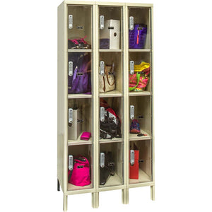 Optimize your storage solutions with the Hallowell DigiTech 36" x 12" x 78" tan triple 4-tier locker. Crafted with a full body of welded sheet steel featuring double flanged connections and single return bends at all sides, this locker is built for long-lasting durability. A high-grade powder coating is carefully applied and baked at 350 degrees Fahrenheit, ensuring a resilient finish that can withstand daily wear and tear. Elevating the unit with 6" feet provides added protection against dirt and potentially harmful cleaning chemicals, keeping its contents safe and clean.