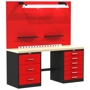 Workbench includes two 18" wide pedestals with drawers or doors, pedestal shelf, 60" wide work top, pegboard, light kit, electrical strip, pegboard shelves.