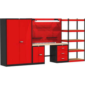 (2) 24" wide pedestals with drawers or doors, pedestal shelf, 72" wide work top, pegboard, light kit, electrical strip, pegboard shelves. Also includes a 48" wide cabinet with internal drawer and one 48" wide shelving unit |
