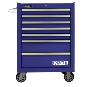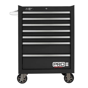 Efficiently organize your industrial workspace with the Homak Pro II 27" 7-drawer roller cabinet, designed for garages, warehouses, and auto shops, providing portable storage convenience. Built to endure frequent use, it features a robust 19-gauge steel body with a powder-coated, UV-resistant finish. This roller cabinet boasts 7 spacious drawers, ensuring a systematic arrangement of tools and supplies for quick access, with the added security of a lockable top drawer.