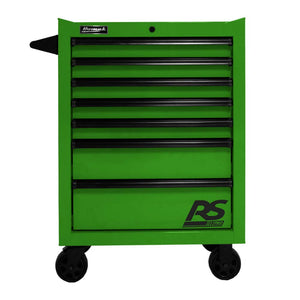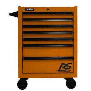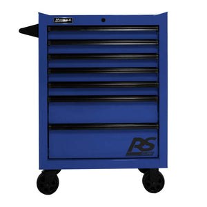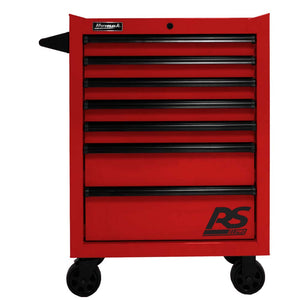 Efficiently organize your industrial workspace with the Homak RS Pro 27" 7-drawer roller cabinet, perfect for garages, warehouses, and auto shops, providing portable storage convenience. Crafted for durability, it boasts robust 18-gauge steel construction with a protective powder-coated finish. The roller cabinet features 7 spacious drawers, ensuring a systematic arrangement of tools and supplies for quick access, with the added security of a lockable top drawer.