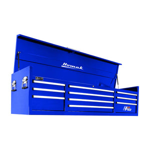 Homak's H2PRO 72" Top Chest and Rolling Cabinet Combo exemplifies unparalleled quality with its 16-gauge steel construction, full extension gas struts, and the HMC high-security tubular locking system, providing top-notch durability and security for your tools. The UV-protected 3.2 mil powder coat finish adds a sleek look, complemented by heavy-duty steel lift and push handles for ease of maneuvering.