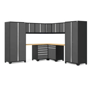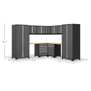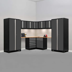 | What’s Included (12 Pieces): | 3 × 36″ Multi-Use Lockers (closet rods + adjustable shelves) 4 × 28″ Wall Cabinets (adjustable shelves) 1 × 5-Drawer Tool Cabinet (full-extension drawers) 1 × Two-Door Base Cabinet (shelf) 1 × Multi-Function Base Cabinet 1 x 24" Corner Worktop 2 × 56″ Stainless Steel Worktops |