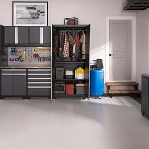 Bid farewell to cable clutter with the integrated cable management system, ensuring a tidy workspace. The soft-closing drawers with tool dividers provide easy access and organization for your tools, simplifying your garage storage. NewAge lockers feature removable closet rods and hooks, providing flexible options for hanging storage.