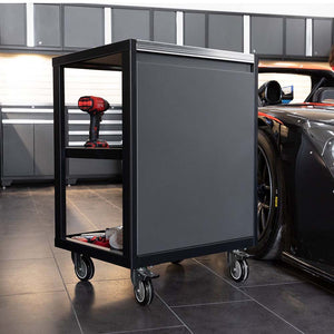 | Components: | (1) Multi-Use Locker (1) Tool Drawer Cabinet (1) Mobile Utility Cart (2) Wall Cabinet (1) 56" Bamboo or Stainless Steel Worktop |
