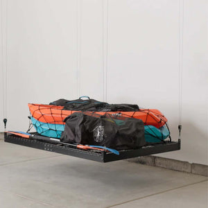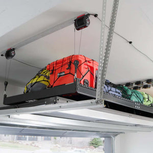 The Storage Platform Lifter features four motors for balanced lifting. For extra security, items with wheels or unique shapes should be secured. Ideal for items like lawnmowers, toolboxes, tents, sleeping bags, and power wheels, it ensures safe and stable storage.