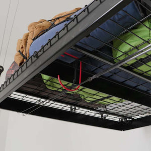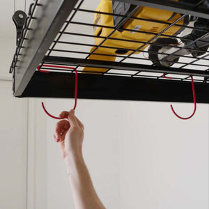 Maximize your storage space with these versatile hooks designed to attach to the deck on the underside of your platform overhead rack (rack sold separately). Perfect for organizing yard tools such as rakes, brooms, hoses, and more, these hooks provide a neat and efficient way to keep your items off the ground and easily accessible. Transform unused space into a practical storage area with this simple yet effective solution.