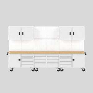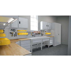 Suite A offers an expansive storage and work area with (4) 24” wall cabinets, (4) 24 x 24” pegboard wall panels, (4) 24 x 24” louvered wall panels, (3) maple butcher block tops, (18) waffle mat drawer liners, (2) 12-piece assorted bin kits, and (2) 10-piece starter pegboard kits..