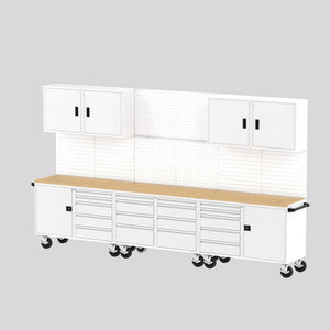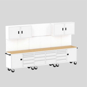 Crafted from heavy-duty 14-gauge steel in the USA, this suite ships fully assembled for your convenience. Installation is a breeze – simply roll the workbenches into place and attach the wall panels and cabinets with the included mounting hardware.