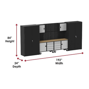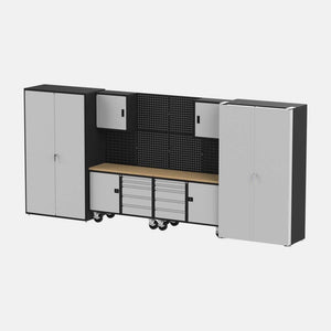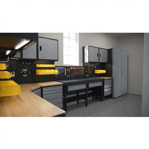Crafted from heavy-duty 14-gauge steel in the USA, this suite ships fully assembled for your convenience. Installation is a breeze – simply roll the workbenches into place and attach the wall panels and cabinets with the included mounting hardware.