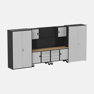 By choosing Suite F, the most extensive preconfigured system, you will benefit from a remarkably spacious and organized workspace that is not only easy to install but also offers a wide array of customization options. Designed with an emphasis on tool storage optimization, Suite F is the ideal solution for those seeking maximum capacity and efficiency in their workspace.